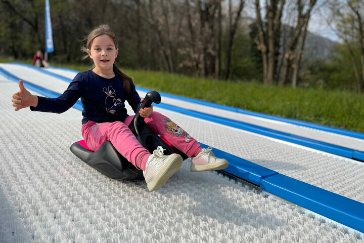 Children from the age of 4 can already whiz down the track sitting upright or semi-upright on the Sklide Bob with a "joystick" in the middle. The Sklide system is quick and easy to assemble and thanks to the parallel tracks, nothing stands in the way of a head-to-head race with the whole family.