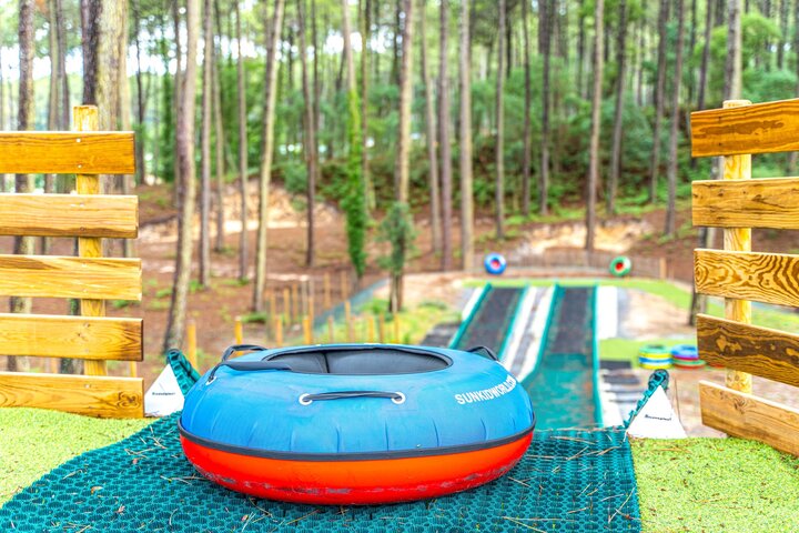 The most fun is to grab one of the 20 colorful slide tires with Sunkid branding and start a race with an opponent. On your marks, get set, go ... and both tube racers hurtle down the steep starting ramp. Thanks to the brake mats, even the fastest tubing descent is guaranteed to end safely at the end of the track.