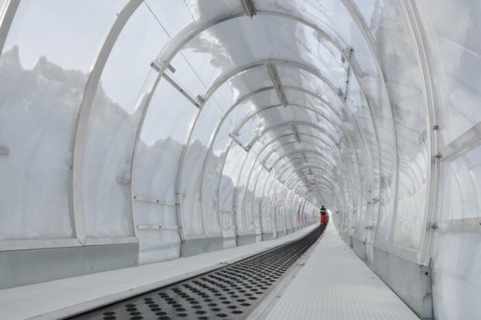 The Sunkid Gallery conveyor canopy in Val Thorens was customized, elaborated in cooperation with the French authorities and certified. Side doors are provided every 50m (standard every 1.8m) and the stations of the entrance and exit are each completely covered. The roofing of the exit station posed a particular challenge, as it is a new type of combined exit.