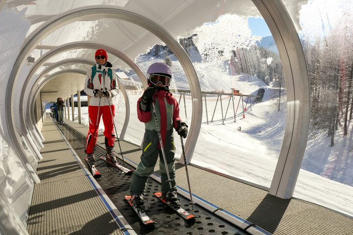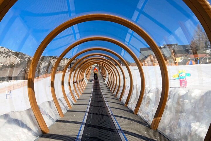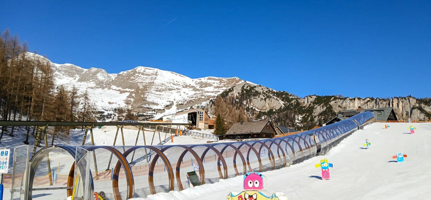 Die Hinterstoder-Wurzeralm Bergbahnen AG hat in den vergangenen zwei Saisonen stark in den Ausbau ihrer familienfreundlichen Infrastruktur rund um die Bergstation der Standseilbahn investiert. Ende 2024 realisierte man zusammen mit dem österreichischen Förderbandspezialisten Sunkid einen Zauberteppich, dessen Anfang und Ende mit einer Evolus-Galerie überdacht sind. Der Mittelteil verläuft in einer Betongalerie, direkt unter der Schiene der Standseilbahn. Bereits zur Saison 2023/2024 erhielt zudem der “Sunny Kids Park” eine moderne Sunkid-Anlage, deren Holzoptik-Galerie sich perfekt in die natürliche Umgebung eingliedert.