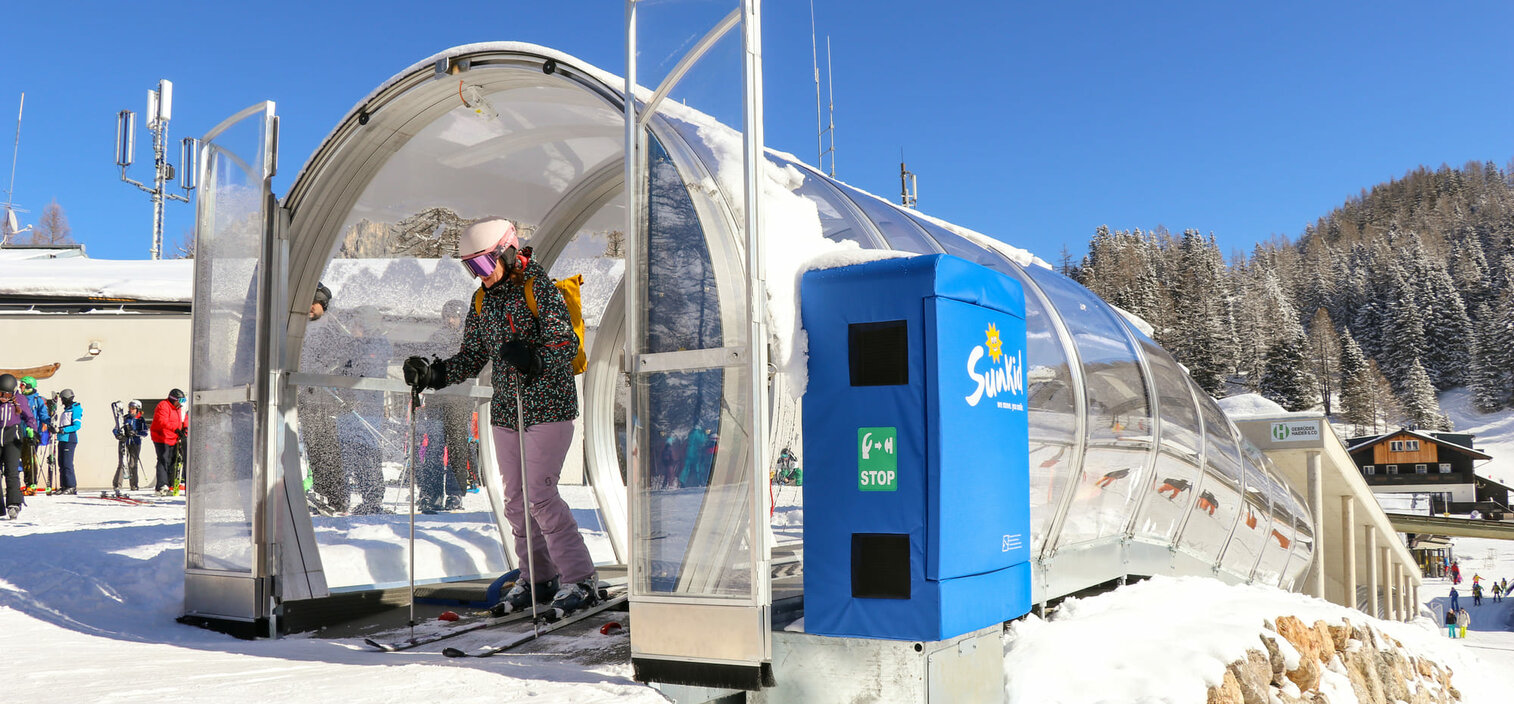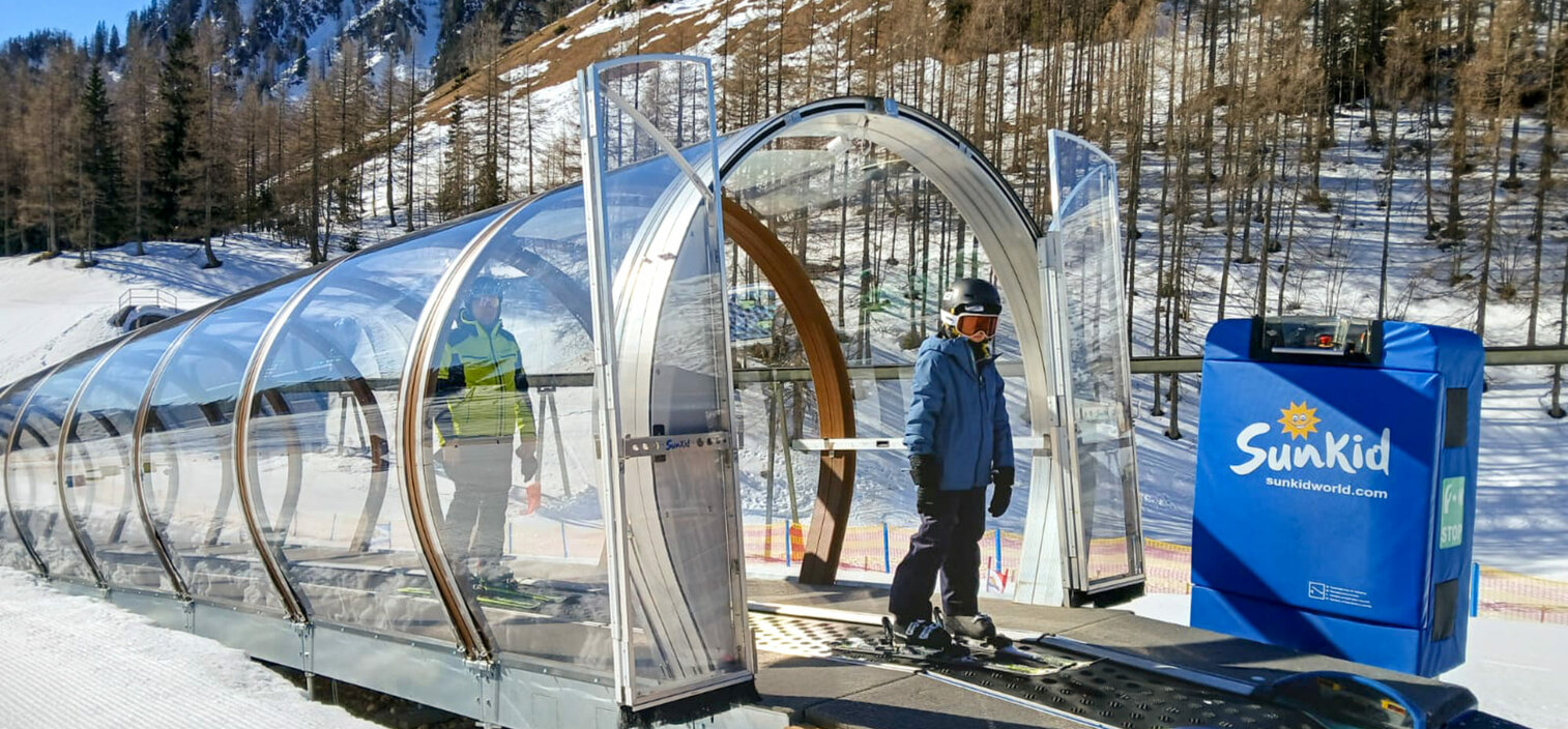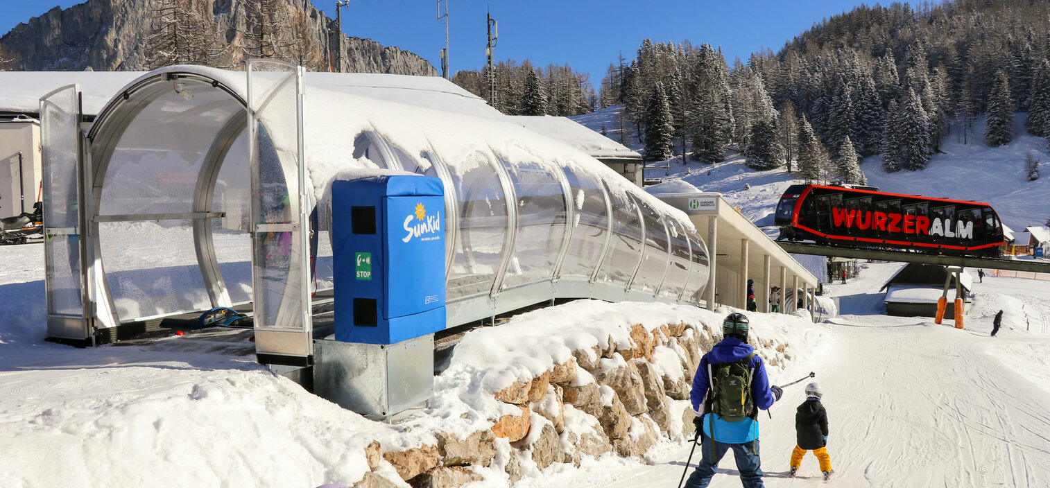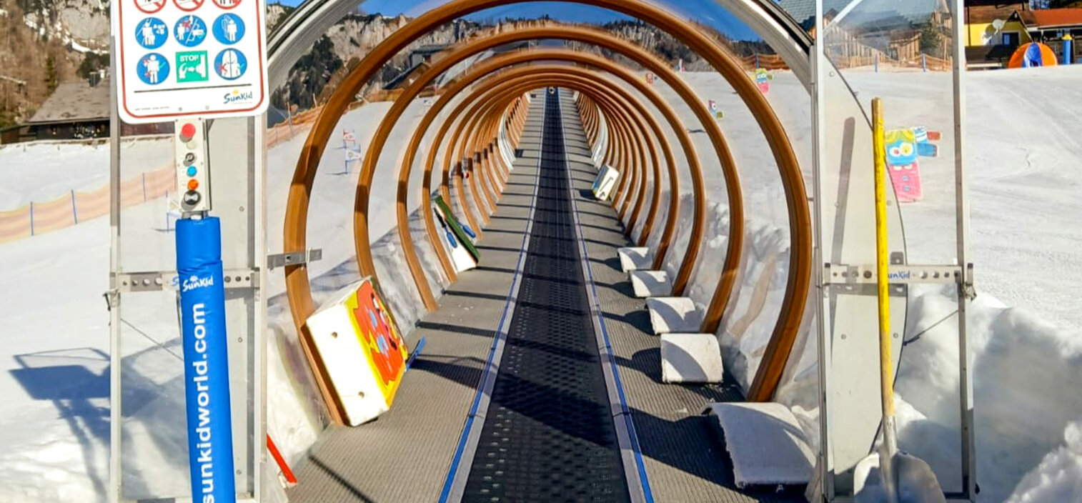 Der zweite 77 Meter lange Zauberteppich im „Sunny Kids Park“ weist mit Sunkid-Schneegrube, Galerie-Flügeltüren beim Ein- und Ausstieg, Slide-up-Notausgängen sowie externem i-CONTROL-Bedienterminal nahezu die identischen Optionen wie die neueste Anlage auf der Wurzeralm auf. Optisches Highlight sind hier in Holzoptik beschichtete Aluminium-Galeriebögen. Bei der Hinterstoder-Wurzeralm Bergbahnen AG fiel die Wahl auf dunkle Eiche – in Abstimmung mit Sunkid lassen sich aber verschiedenste andere Holzoptiken sowie RAL-Farben realisieren. So kann jeder Kunde seine Anlage passend zum Corporate Design oder zur Umgebung nach eigenen Wünschen designen.