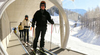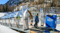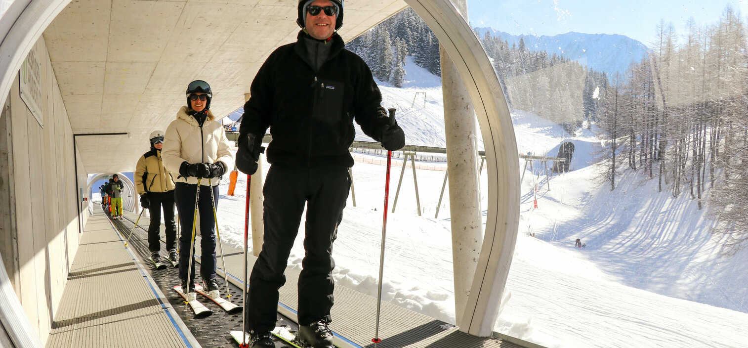 Sunkid-Projektleiter Michael Neuböck ergänzt: „Wichtig bei diesem Projekt war die genaue Abstimmung aller Beteiligten mit der Baufirma des Betontunnels unter der Seilbahntrasse. Dieser wurde auf den Zentimeter genau errichtet und somit war auch unser Förderband mit der Sondergalerie stimmig.“ Schließlich überdacht eine Sunkid-Evolus-Galerie sowohl den Anfang und das Ende des Förderbandes, der Mittelteil verläuft im Betontunnel – und da sind die Anschlussmaße entscheidend. „Bei der Galerie“, so Neuböck, „haben wir im Bereich vom Betontunnel einen speziellen Unterbau mit breiten Abdeckungen gefertigt. Der Betontunnel kann aufgrund unserer Abdeckungen über die ganze Fläche genutzt werden.“