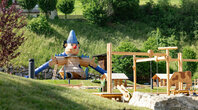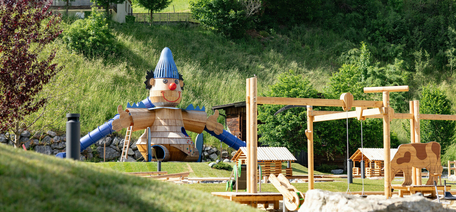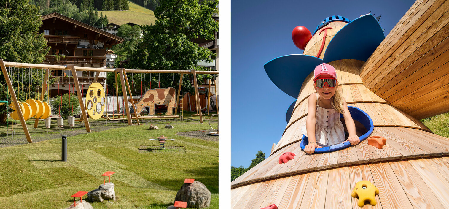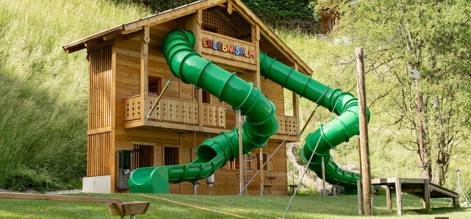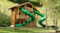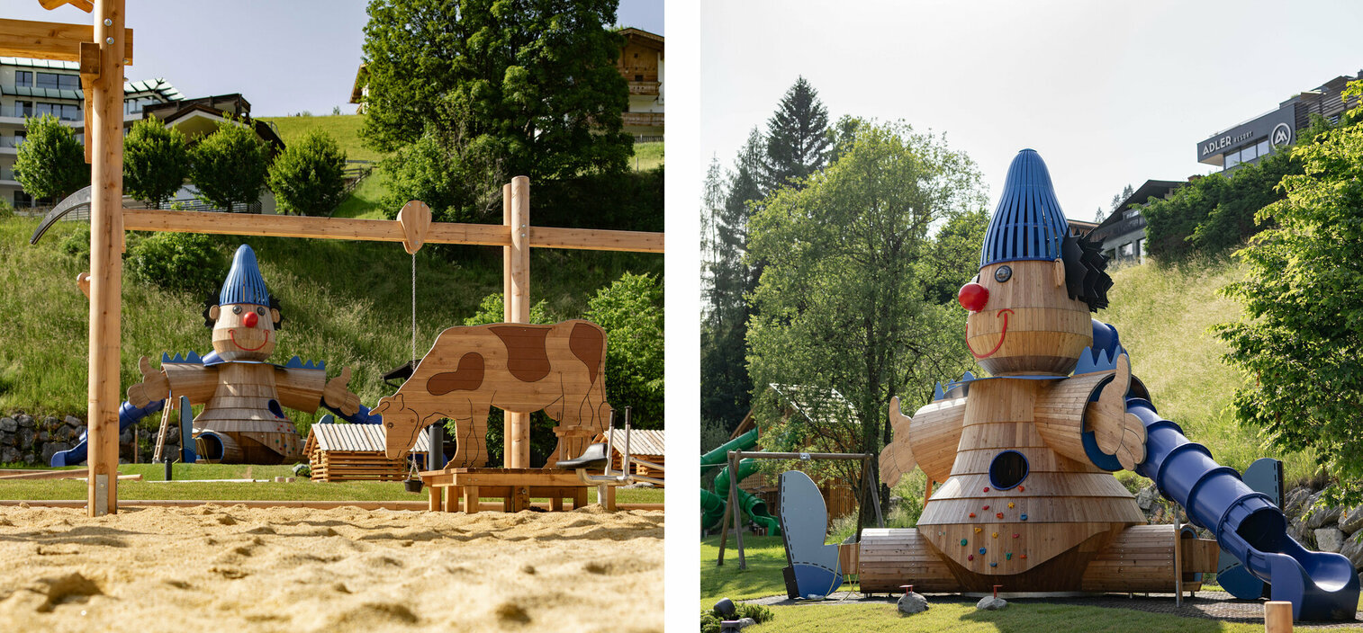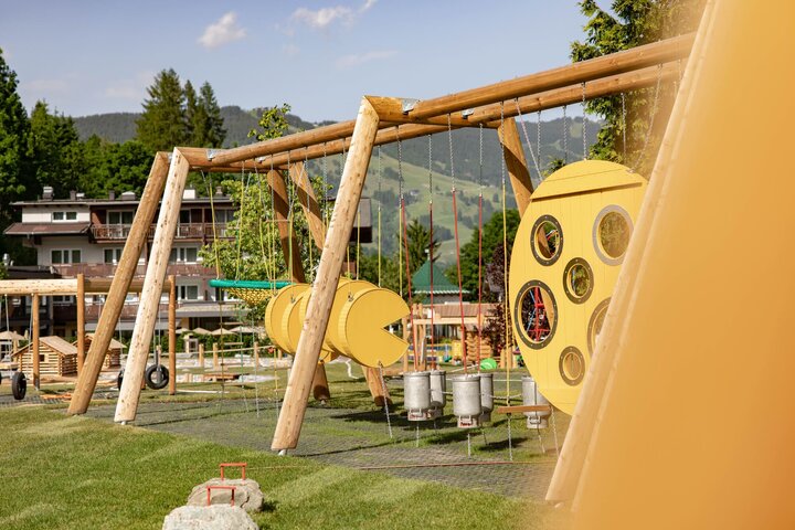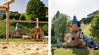 Hier gibt es nun einen thematisierten Wasser- sowie Sandspielplatz, eine gigantische Almhütte mit Rutschen, eine Aussichtsplattform, Seilbahn und Baumkarussell, Kletterzonen und Motorikstrecken, Kugelbahnen und sogar eine Eltern-Kind-Schaukel. Dabei wurden nahezu alle Spielstationselemente und -geräte aus dem nachhaltigen, regionalen und unbehandelten Werkstoff Lärchenholz gefertigt.