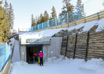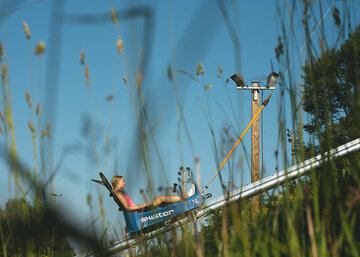 The Wasserkuppe ski and toboggan arena has added a Luna Loop ride to its offerings. After inserting a coin, up to two people can take a seat in the gondola, which moves in circles on a circuit with small curves and can be interactively made to roll over by the users. The loops are possible both forward and backward.