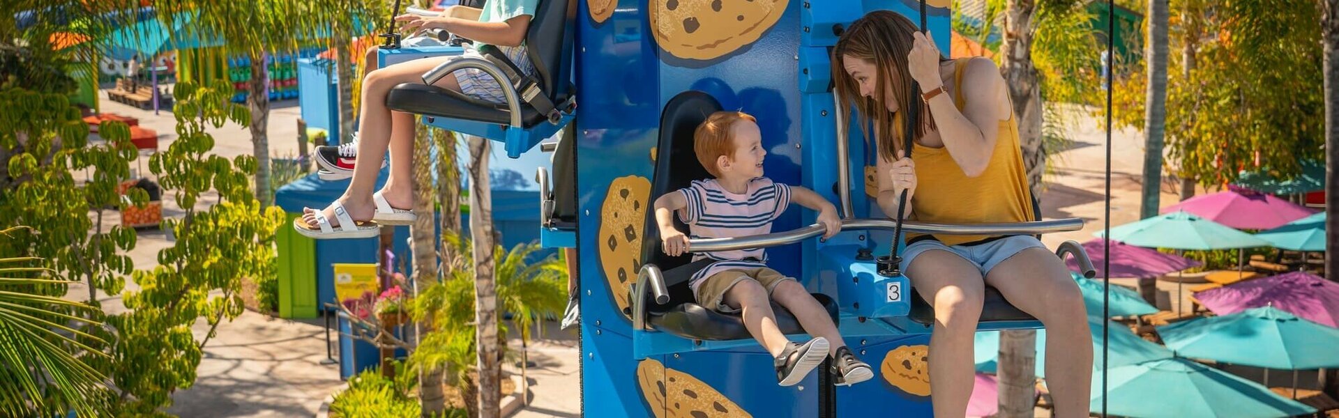 The operating principle of the Cookie Climb is simple: By pulling the rope of the Cookie Climb, the double seat moves upwards with motorised assistance, so riders. can decide how high they want to go. When the rope is released, the double seat gently, allowing riders to go up and down as they please. During the ride, the Cookie Climb rotates around its own axis, rewarding riders with a magnificent panoramic view of Sesame Place San Diego.