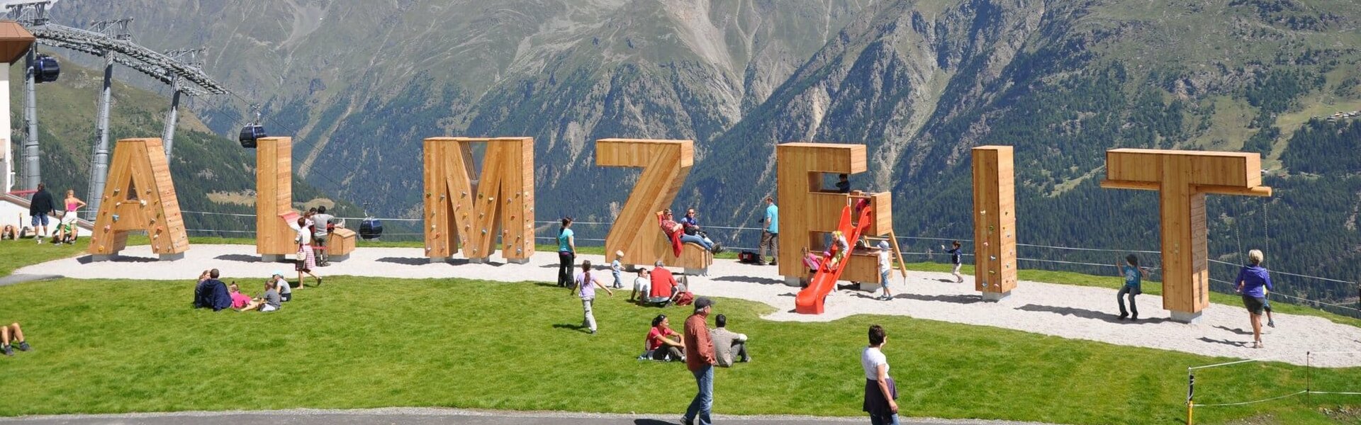 Next to the large-scale information boards at the middle station of the Gaislachkoglbahn is the "ALMZEIT" sign, which is about three meters high. This is equipped with a slide, climbing facilities and loungers.