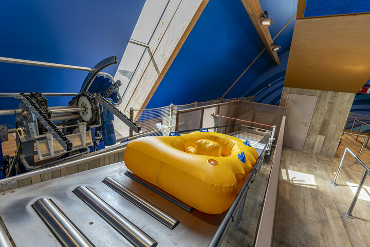 To overcome the 17-metre height difference, the double sliding rafts are placed on a five-metre-long roller table by the passengers. When the traffic lights turn green, a park employee pushes them onto a lifting system with a conveyor, which finally sends every tube upwards.
