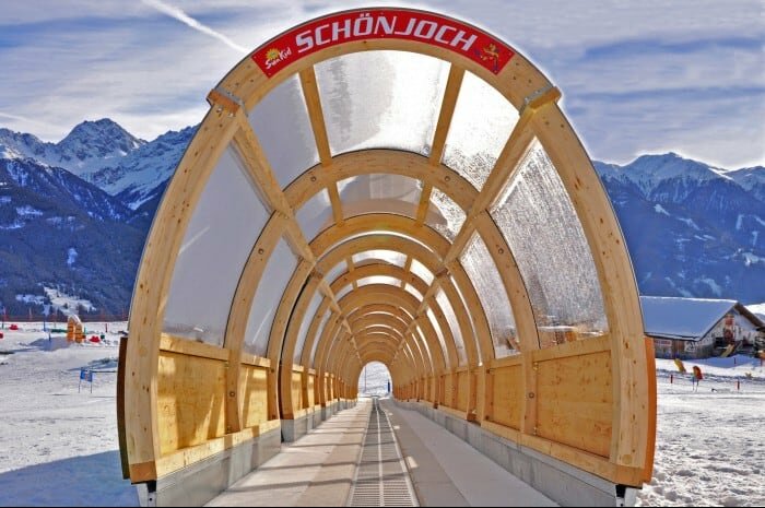 The main connection from the Kinderschneealm to the gondola lift and the restaurant is a 70-meter Moving Carpet by Sunkid. This installation can transport guests both downhill and uphill (i.e. in both directions). Sunkid was given the task by the customer of equipping this main artery, which is used all year round, with a canopy that would visually fit into the overall concept of the new Kinderschneealm. So Sunkid, together with its partner Almholz, developed a wooden gallery modeled on a Tyrolean stable. A particular challenge here was two cable cars that cross just above the gallery. An appropriate safety concept was developed in close cooperation with the Tyrolean provincial government. The conveyor belt and wooden gallery were approved by the authorities at the beginning of December without any problems. As a result, 14 Sunkid conveyor belts have been in operation in Serfaus since this year, half of which are covered.