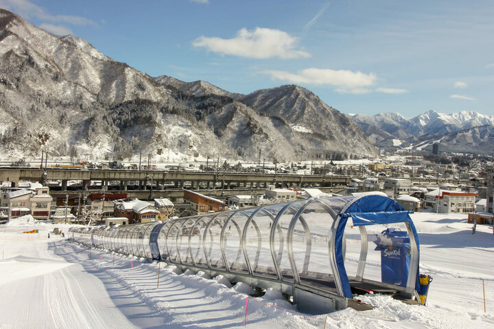Two Sunkid conveyor belts were recently installed in the "Snow Play Park" at Yuzawa Kogen Resort in Niigata Prefecture, where visitors can play safely in the snow. One of them is equipped with a gallery and, with a total length of around 100 meters, is one of the longest covered conveyor belts for snow sports in Japan. The second facility is a standard model.
