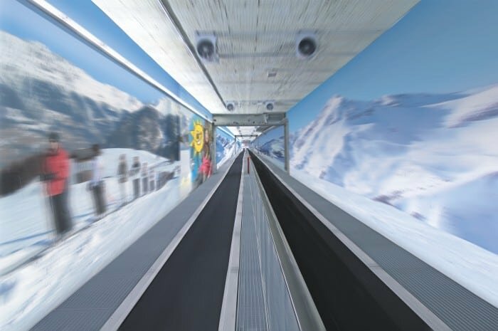 As the main means of ascent, the operational safety of the Sunkid Moving Carpet is an important criterion for the operator. Supervision is provided by an external operator control center, from where the entire conveyor belt route can be viewed via cameras. Orderly access to the 1.2 m/s conveyor belt is guaranteed by an access barrier. The terrain at the entrance is slightly sloping, so winter sports enthusiasts can slowly ascend the conveyor belt. At the entrance there are no problems for skiers, snowboarders and also pedestrians despite the high speed. At the end of the conveyor belt is a sloping area, which has been covered with plastic mats. Since there is no ice or snow at the exit, but the winter sportsmen always find the same conditions, the exit from the 400m Moving Carpet is much easier. The user-friendly design of the exit minimizes shutdowns and further increases operational safety.
