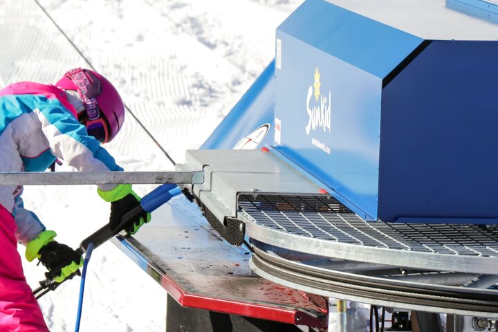 It is very easy to get on the Sunkid Comfort Starsmall ski lift without alift operator’s help. Guests from all age groups merely need to grab the bracket as it passes them at low speed to clamp it between their legs. Getting off is just as easy: let go of the bracket, and it will slip out from between your legson its own.