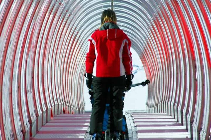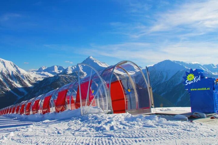 Next to the newly built 8-person gondola, a new beginner's area was created below the top station. There, skiers and snowboarders have access to an innovative Sunkid Moving Carpet conveyor belt for the return ascent, which is also used as a return system. With a length of 111 meters and the gallery conveyor belt roofing, this Moving Carpet becomes the visual highlight on the Schwemmalm. Surrounded by a breathtaking mountain backdrop at 2,000 meters above sea level, the ride on the Moving Carpet becomes a fascinating experience!