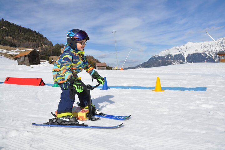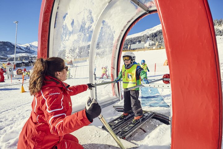 Avec le V-Fly, les enfants apprennent ensuite à prendre des virages - "en un tour de main". Le moniteur de ski dirige le V-Fly en marche arrière dans la direction souhaitée et l'élève se met instinctivement "à genoux" du côté où le moniteur de ski pousse le V-Fly.