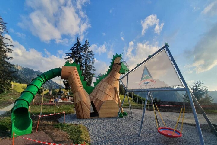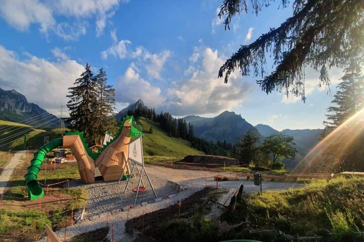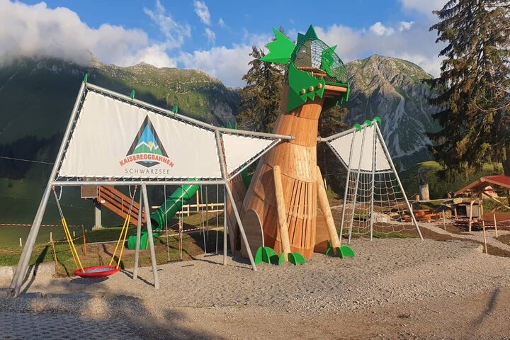 Pendant la montée en télésiège "Riggisalp", on peut déjà le découvrir - le Drachenland Kaisereggbahnen. À côté de la station supérieure se trouve le dragon ludique en bois de mélèze résistant aux intempéries et divers équipements de jeu, comme par exemple une bascule à ressort pour dragon. La tête du grand dragon est accessible, la queue est un toboggan et une grande balançoire combinée se trouve à côté.