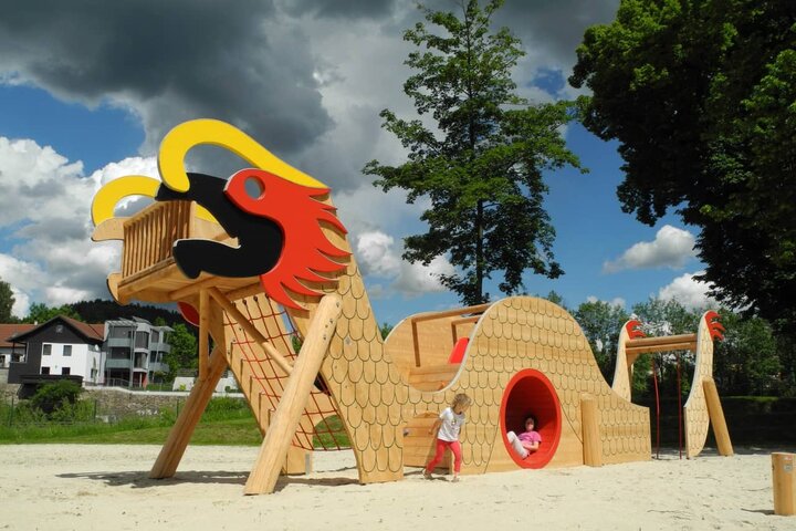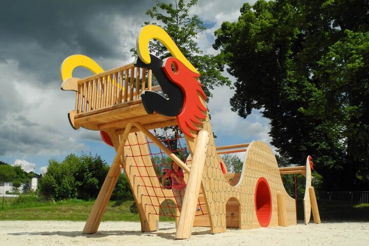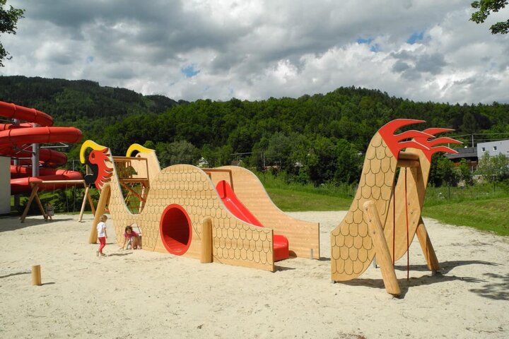 Avec ses 12 mètres de long et plus de 3,5 mètres de haut, le dragon de jeu n'est pas seulement très impressionnant, il offre aussi suffisamment de place et de possibilités pour grimper, glisser, se cacher, se balancer, etc. Cet équipement de jeu a été spécialement conçu par Almholz, partenaire de Sunkid, pour la thématisation de l'Asia Spa à Leoben et répond bien sûr à la norme EN 1176 relative aux aires de jeux. Autour du dragon se trouvent d'autres équipements de jeu en bois qui correspondent au thème choisi.
