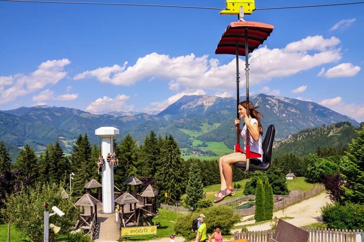 Che cosa collega il percorso tematico con attrezzature da gioco su misura, tra cui una caratteristica dell'acqua, il parco giochi sulla montagna con varie giostre e la possibilità di sciare non lontano da Vienna, anche in estate e senza neve?