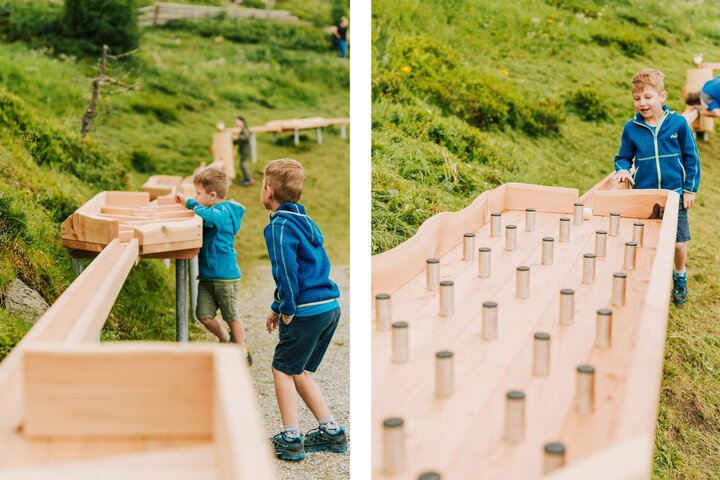 Le piste fanno parte della gamma di prodotti Sunkid Wood'n'Fun e sono state sviluppate appositamente per l'uso all'aperto nelle Alpi. Il robusto legno di larice, resistente alle intemperie, garantisce una lunga durata. L'aspetto naturale si integra armoniosamente nell'ambiente circostante.
