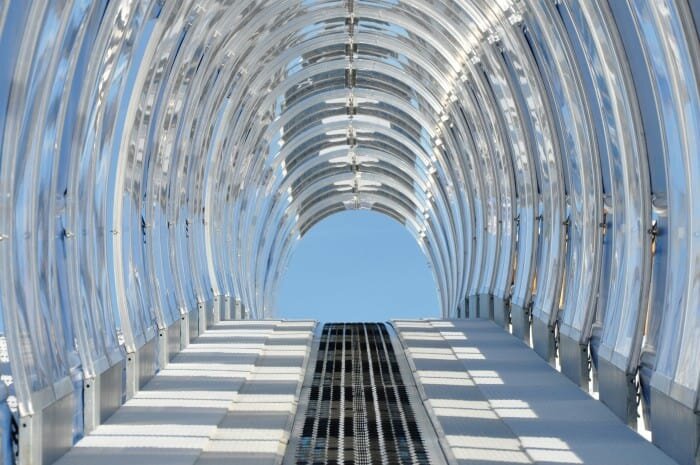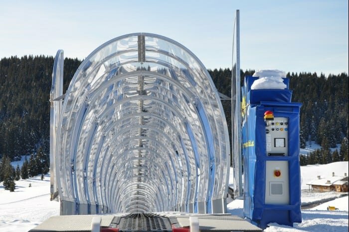 Attraverso i vetri trasparenti in policarbonato resistente ai raggi UV di 3 mm di spessore della galleria, gli appassionati di sport invernali godono di una fantastica vista sulle montagne circostanti. Inoltre, una larghezza interna di 2,2 m e un'altezza interna di 2,3 m garantiscono una generosa sensazione di spazio. La Galleria Sunkid può essere installata su qualsiasi modello di tappeto magico Sunkid e può anche essere adattata a installazioni esistenti. I singoli elementi sono costituiti da un profilo di alluminio e pesano solo circa 25 kg. L'uso di questo materiale di costruzione di alta qualità permette un montaggio facile e veloce da un lato e garantisce un'alta stabilità e durata dall'altro. Grazie alla collaudata costruzione modulare, i terreni concavi e convessi non sono un ostacolo per la Galleria Sunkid. I teloni autoretrattili alle uscite permettono di aprire la galleria rapidamente e facilmente, anche a basse temperature e con i guanti. Nella valle e nella parte superiore della struttura, la galleria è chiusa durante la notte per mezzo di cancelli con serratura.