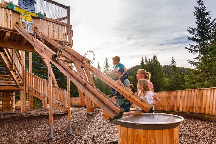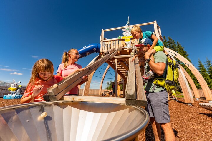 Il coniglio "Hopsi", la mascotte della destinazione per famiglie Schladming, accoglie i suoi ospiti estivi nel parco giochi più alto della provincia austriaca della Stiria. Su un percorso circolare lungo 1,5 chilometri, grandi e piccini possono fare molte esperienze e rimanere attivi fisicamente e mentalmente. Piste di palline, mondo acquatico con ricerca dell'oro, percorso motorio, area bici: ci sono diverse stazioni di gioco a tema da esplorare, scoprire, scalare e mettere alla prova la propria atleticità.