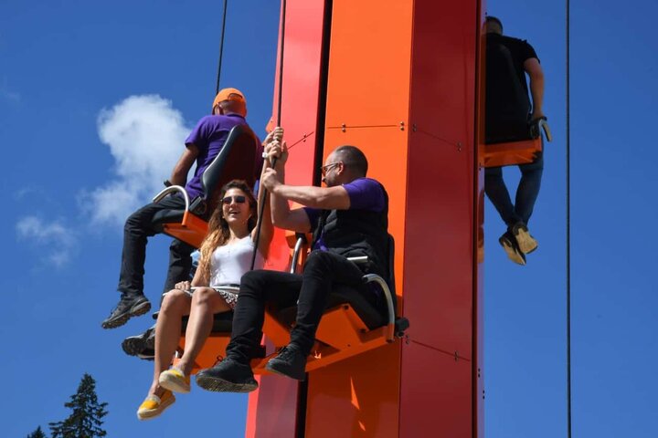 La terza corsa è lo Skydive, che è stato messo in funzione nella zona rurale-alpina del Centro Olimpico. Dopo un giro in ascensore nella bellissima area scientifica con viste spettacolari, vi aspetta un giro vario sullo Skydive. Non appena la barra del sedile viene chiusa, la corsa può iniziare. Il sedile viene tirato in aria e poi scivola due volte sul serbatoio.