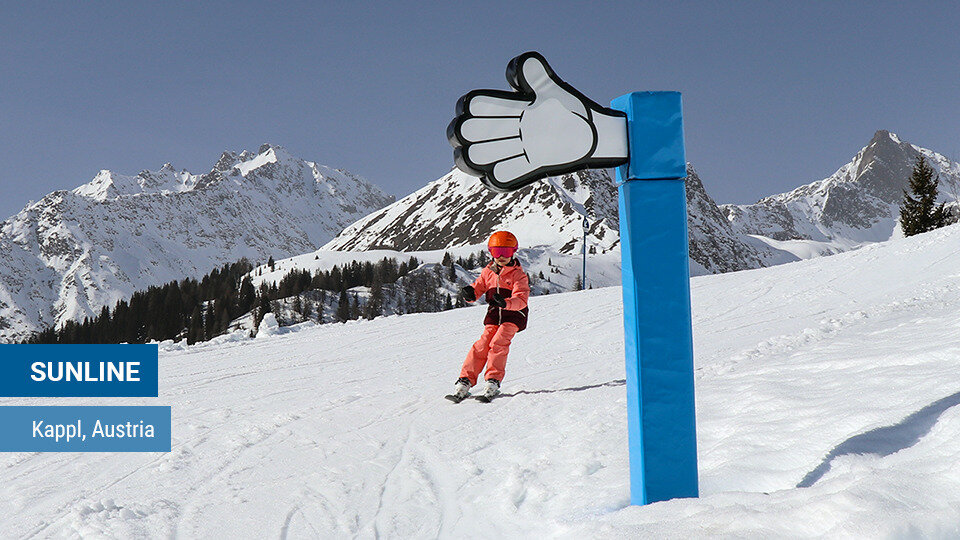 Monster-Elemente aus dem Sunkid-Produktportfolio „Sunny Stuff“ runden das Erlebnis bei jeder Abfahrtsvariante – zwei Wege stehen in Kappl zur Verfügung – ab. Turn-around Maxi und High/Low 5 Maxi sind genauso wie das abschließende Monster Ski Boxing mit Maskottchen-Aufdrucken und Comic-Sprechblasen versehen. BANG! Schon wird die herabhängende Schaumstoffscheibe dieses Elements in die Luft katapultiert und die Kids sind sofort wieder bereit für die nächste erlebnisreiche Sunline-Abfahrt.